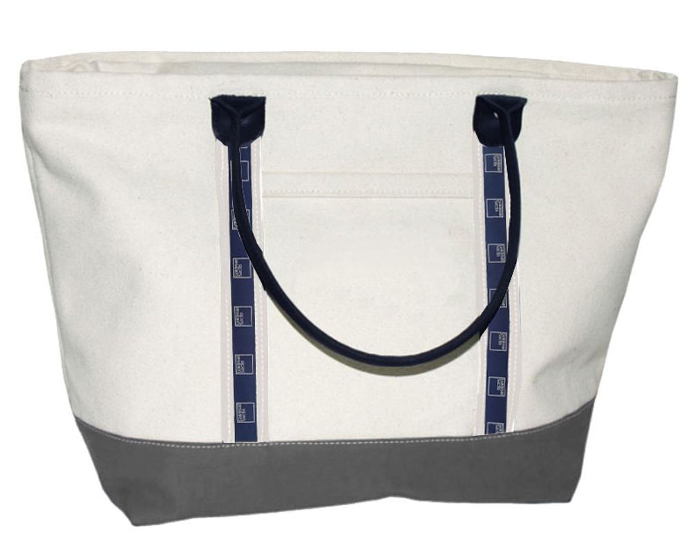 Natural canvas bag with natural webbing, charcoal bottom, and black leather handles. Goldman Sachs logo ribbon. Features inside zipper pocket.